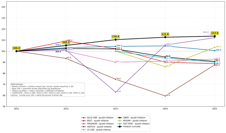 Une érosion du revenu horaire réel qui demeure majoritaire sur la période longue. Malgré certaines améliorations ponctuelles observées en 2025, le rapport montre que, pour la majorité des plateformes analysées, la progression du revenu horaire nominal ne compense pas pleinement l’inflation cumulée sur la période.