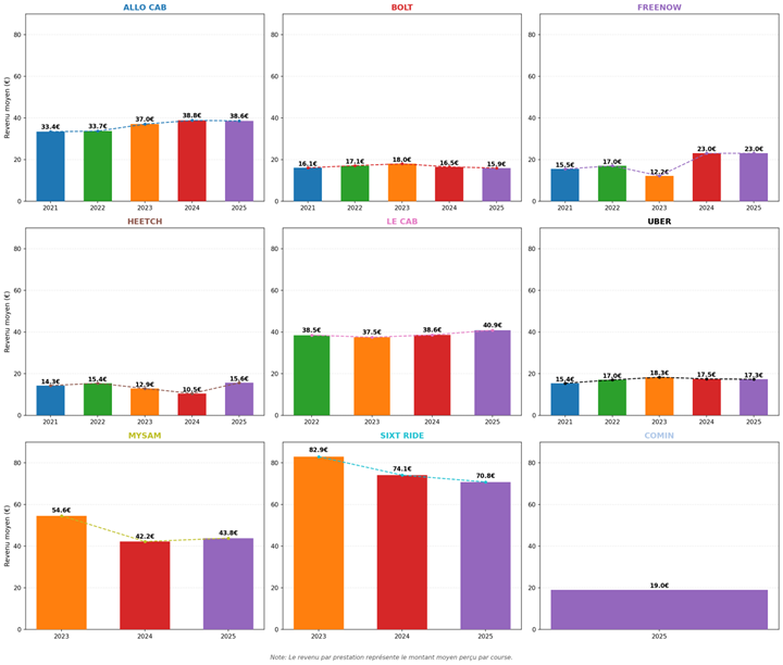 Des évolutions contrastées du revenu moyen par prestation. En 2025, le revenu moyen par prestation présente un bilan contrasté selon les plateformes étudiées : certaines enregistrent un rebond marqué, d’autres une stabilisation, tandis que plusieurs poursuivent une tendance baissière ou atone. Le rapport confirme ainsi la diversité croissante des évolutions observées au sein du secteur.