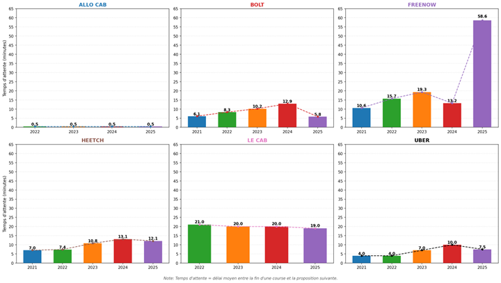 Des inflexions notables en 2025. Dans le périmètre analysé, l’évolution annuelle du revenu horaire brut va de −3,4 % à +48,6 %. Les temps d’attente enregistrent eux aussi des variations particulièrement marquées, comprises entre −54,7 % et +343,9 % en 2025.