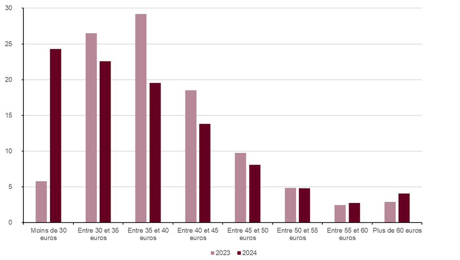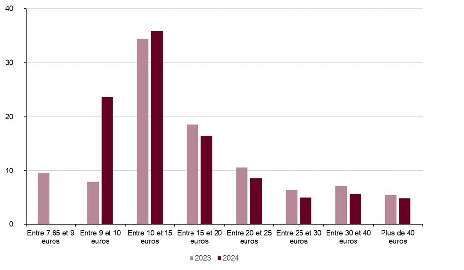 © SDES Note : les courses annulées et les bonus/incitations des plateformes ne sont pas inclus. Champ : France métropolitaine, courses réalisées par des chauffeurs actifs entre le 2 septembre 2023 et le 27 octobre 2023, ainsi qu’entre le 1er septembre 2024 et le 26 octobre 2024. Les premières tranches visent à illustrer l’impact du nouveau tarif minimal par course. Sources : données des plateformes VTC ; calculs SDES. |